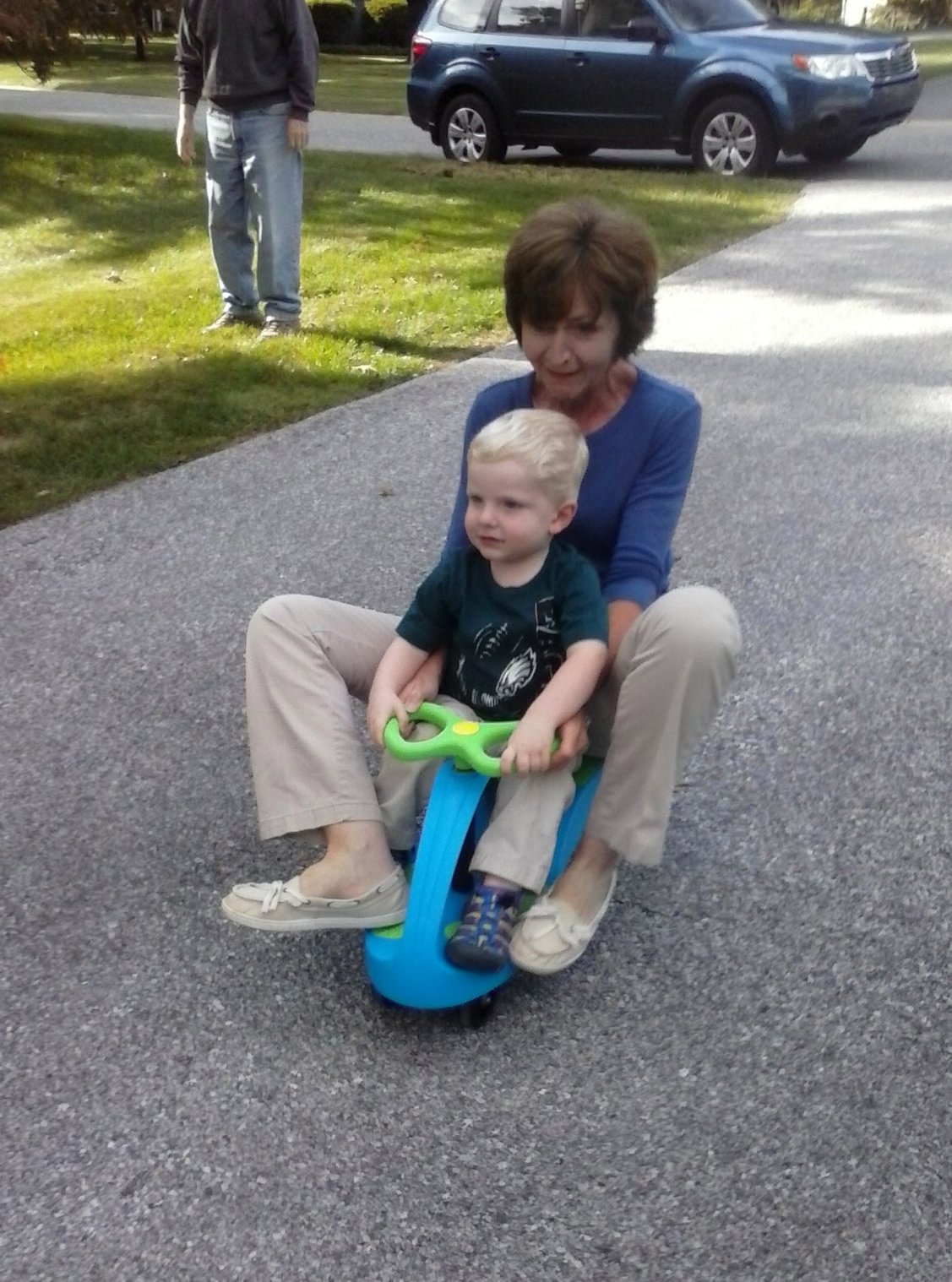 Tom watches Liz and Patrick ride on Patrick's new car.
