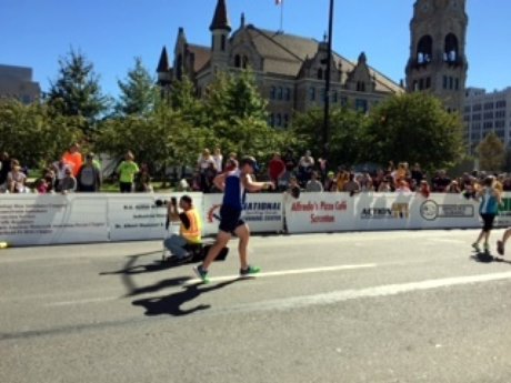 PJ almost to the Finish Line in the Steamtown Marathon.