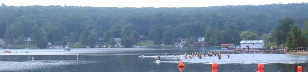 Year: 2012 (camera record) Photo Number: 5626 Photo Shot: Wilkes-Barre Area Event Shot: Wilkes-Barre Triathlon (2012) Comments: The swim course, a 1.5 kilometer loop in Harvey's Lake, has begun as one of the 5 waves starts the triathlon.