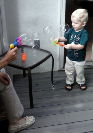 Comments: Liz and Patrick playing with Patrick's new bubble making machine.